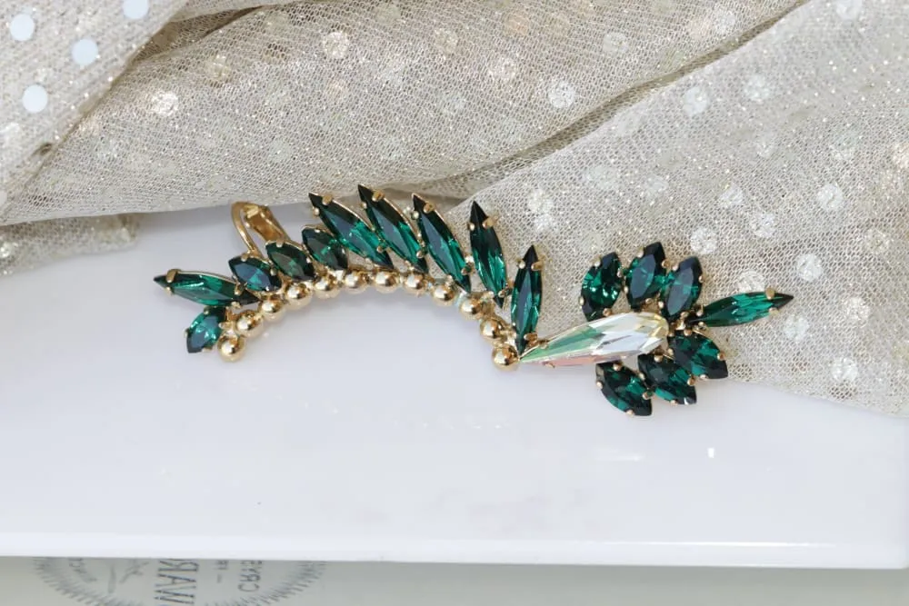 EMERALD CLIMBING EARRINGS, Ear Cuff Earrings, Ear Crawler Earrings, Trending Earrings, Rocker Bride Jewelry, Rebeka Ear Climber Earrings