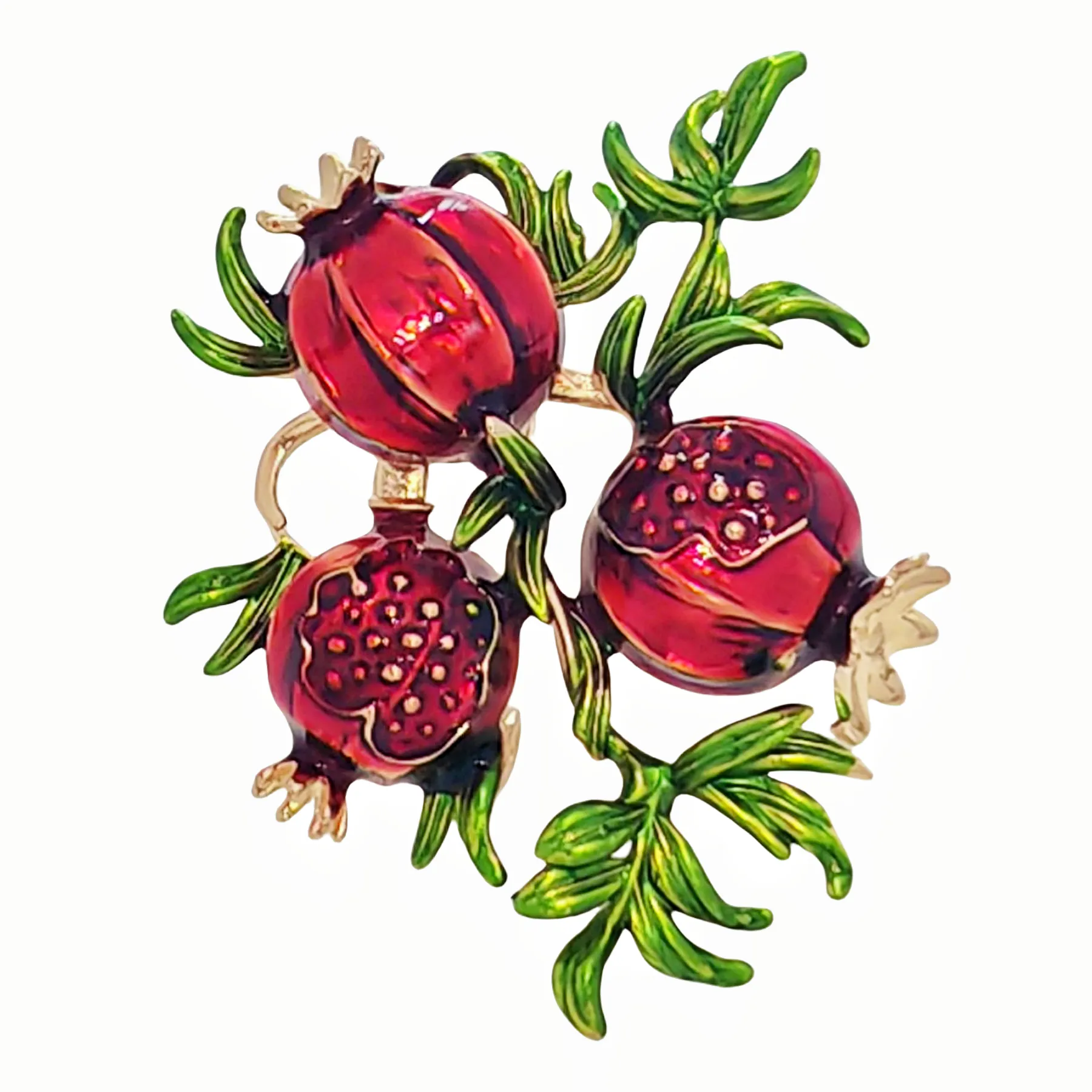 - A beautiful and delicious pomegranate brooch that has red enamel and green leaves in gold tone. The brooch is shaped like a fruit with realistic details and texture. The brooch is a great gift for women who love fruits, casual weddings, or pins and needles. It is also a lovely decoration for your coat or clothing accessories. This brooch is a charming and festive gift for her.